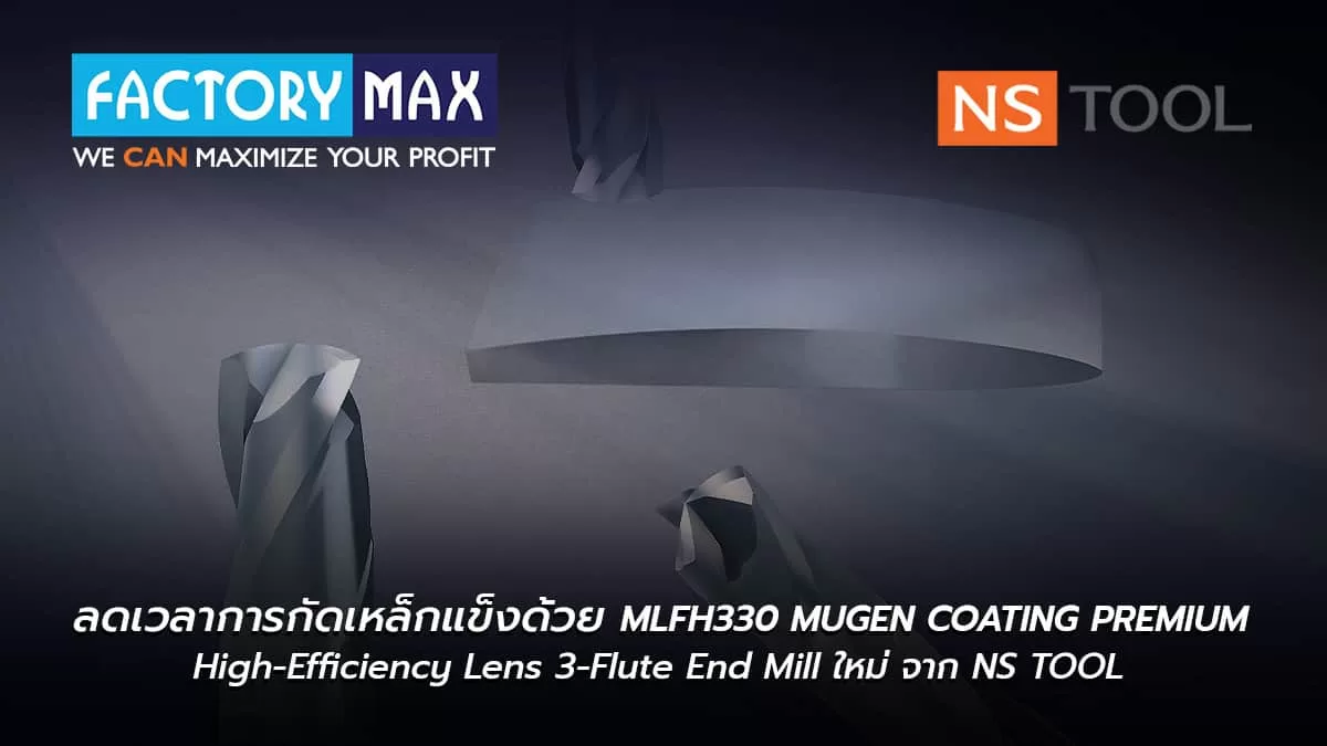 Reduce hard steel milling time with the new MLFH330 MUGEN COATING PREMIUM High-Efficiency Lens 3-Flute End Mill from NS TOOL.